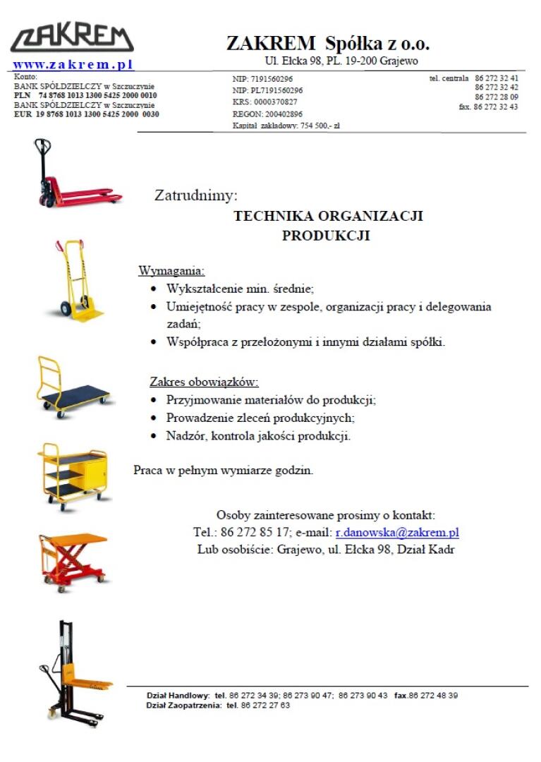 Grajewo ogłoszenia: Zatrudnimy: TECHNIKA ORGANIZACJI PRODUKCJI